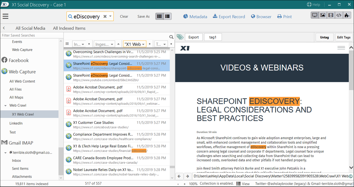 Automatically captures web pages, social media posts, and comments.